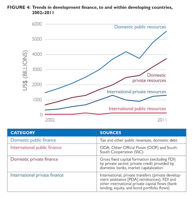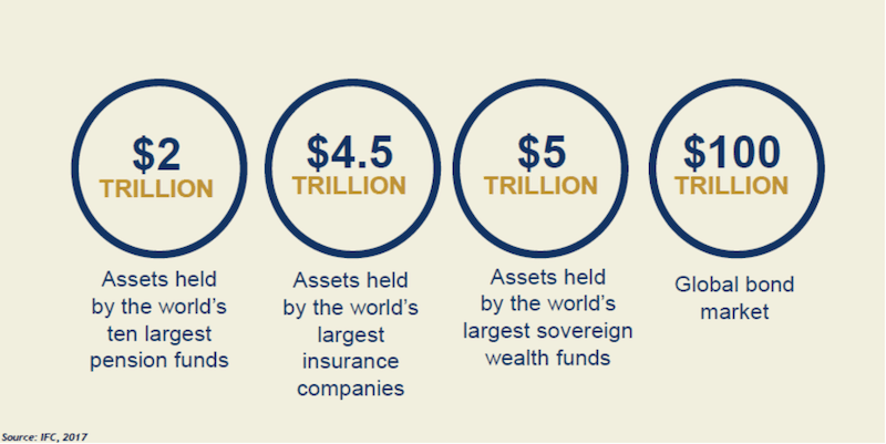 To close this gap, donors are applying more nontraditional methods of funding that engage different sources of capital. According to the International Finance Corporation and seen in the graphic below, there are trillions of dollars in private capital that can be tapped for development, amounting to $2 trillion in assets held by the world’s 10 largest pension funds, $4.5 trillion in assets held by the world’s largest insurance companies, $5 trillion in assets held by the world’s largest sovereign wealth funds and $100 trillion in the global bond market.