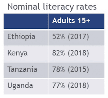 These multiple literacy gaps are widespread in sub-Saharan Africa. The assumption that those who graduate from primary school are literate and numerate is fundamentally flawed. Thus, these estimates of literacy rates (see the table we compiled to the right) significantly understate the problem — perhaps by as much as 100%. And numeracy presents an even larger challenge: FinScope Tanzania 2017 noted that in Tanzania only 71% of adults can add, 59% can subtract, 40% can multiply and 46% can divide.