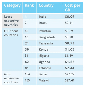 Data is expensive across Africa. For example, data in Nigeria is more than twice as expensive as in Pakistan (see table to the right), which has roughly the same population — around 220 million.