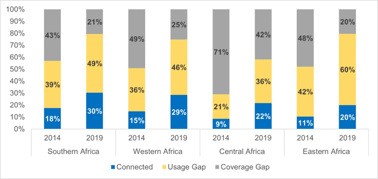 The result is a significant usage gap between those who have internet coverage and those who actually use it, which has persisted even as the coverage gap has reduced, as seen in GSMA’s work on this (see bar chart below).