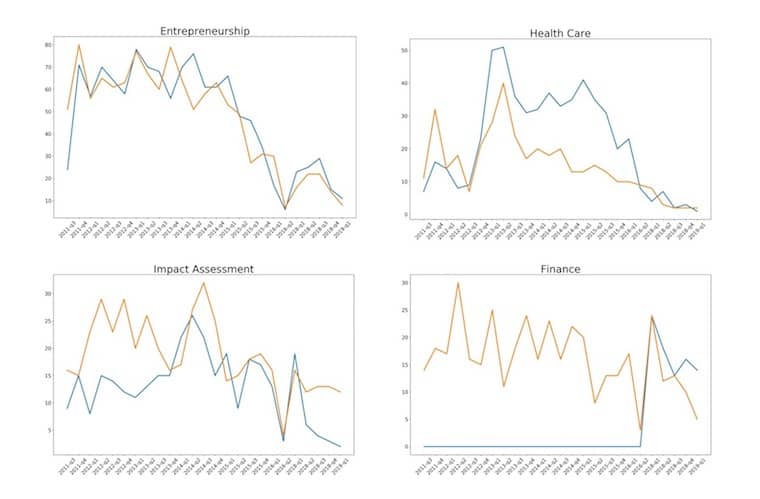The frequency of each category-topic pairing over time is shown below, where NextBillion categories are the blue lines and LDA topics are the orange lines. If the LDA algorithm is working effectively (and the NextBillion editors are equally effective at assigning accurate topics to the articles), you’d expect to see similar trajectories in the two lines.
