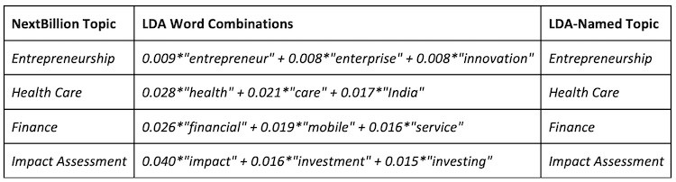 Here’s how we trained our LDA algorithm on the NextBillion blog posts. We began by generating 10 subject-matter topics from the corpus, four of which are shown in the table below as an example. These topics were chosen because they match up with some of the most commonly used NextBillion categories, shown in the first column of the table. Each topic is represented by a weighted list of words generated by the LDA algorithm, and based on words that appear frequently in the NextBillion articles about those topics, as shown in the second column of the table. We then manually named the topics based on their word composition, as shown in the third column of the table.
