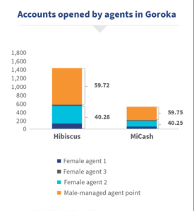 - A focus on the acquisition of women agents: The innovation lab project focused on onboarding women agents. As of August 2020, three women agents (among a group that included 11 male agents) had opened 40% of the agent-managed accounts, both MiCash and Hibiscus. On average, each female agent opened 141 Hibiscus accounts compared to 62 Hibiscus accounts per male agent. This indicates that women agents were more successful in onboarding women customers. Evidence from other geographies like India and Kenya also suggests that women agents draw more women customers.