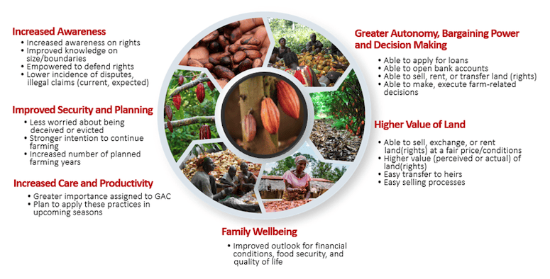 Making matters worse, cocoa farmers often have a very precarious relationship with the land they depend on. Lack of formal land rights can affect locally indigenous communities as well as the descendants of migrants from other regions or nearby countries. More broadly, land tenure and property rights are increasingly seen as critical for eliminating poverty, due to the role of land in enabling prosperity, food production and housing. Stronger property rights can strengthen farmers’ hold over their main asset and create opportunities for leveraging it through credit, improving their financial health and resilience.