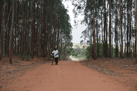 A bicyclist walks through Portucel’s eucalyptus plantation.