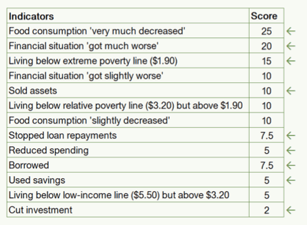 Coping mechanisms: These include behaviours like using savings, borrowing money, stopping loan repayments and selling assets. While these strategies are no doubt effective, they can only be deployed up to a certain point. And doing these things (e.g. using savings) may make a family more vulnerable to a longer-lasting external shock, and may also make it harder for the family to get back to their pre-COVID-19 situation. To reflect this, we awarded more points for activities like selling assets, and fewer points for activities like cutting investment.