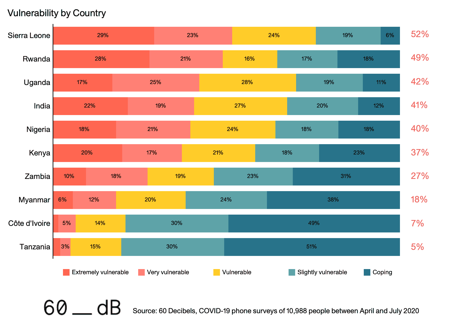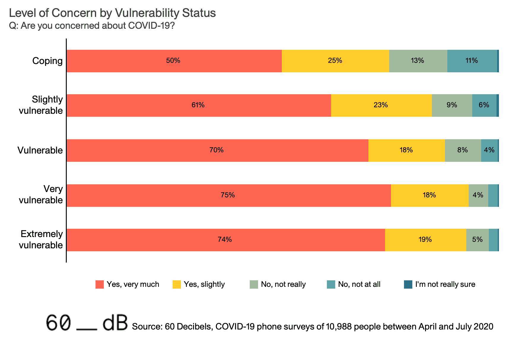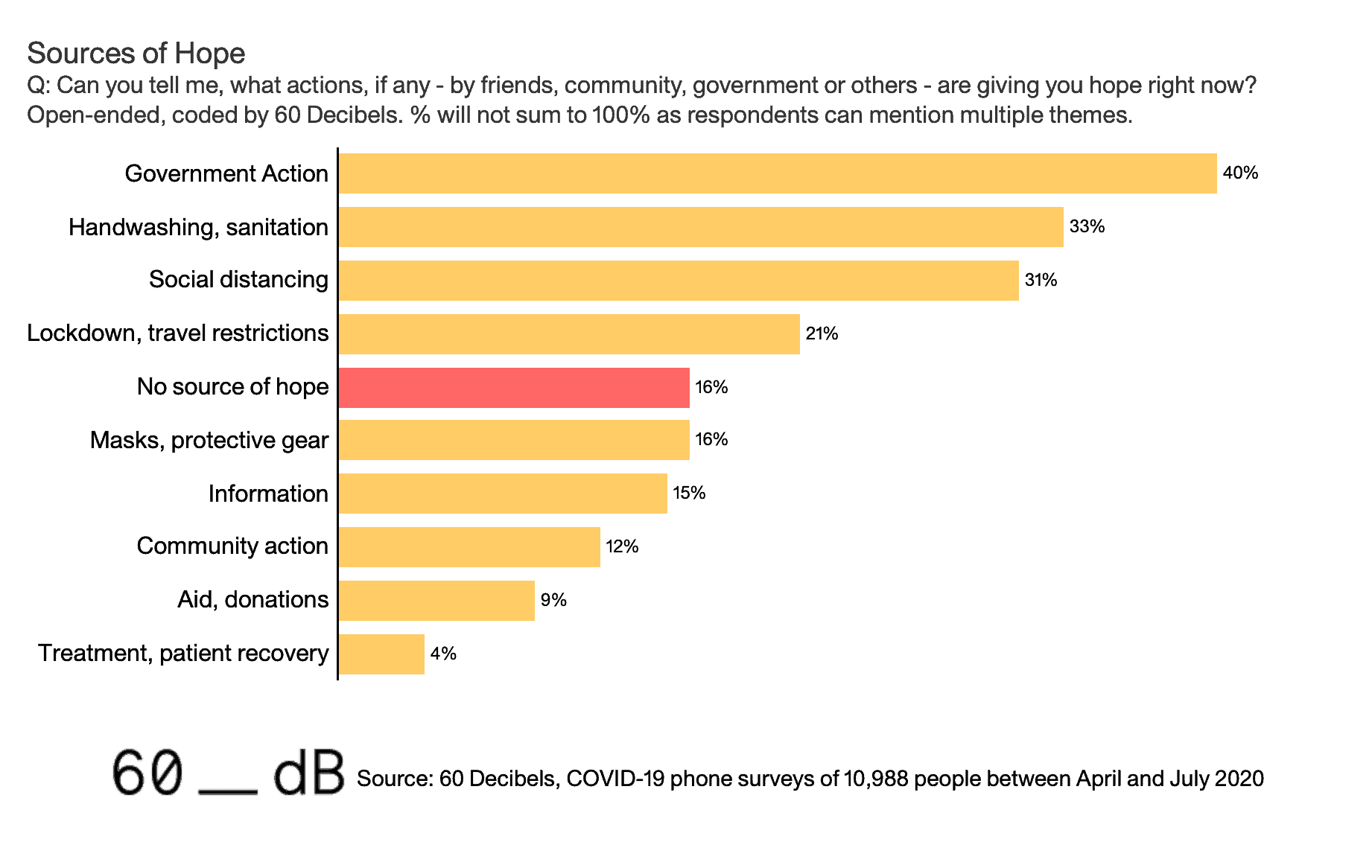 Until then, we encourage you to visit the 60 Decibels COVID-19 dashboard, where we’re adding new indicators and analysis, as well as more responses from more countries and customers, each week. We welcome your input on these efforts: Please let us know what topics or questions are not covered that would help you or your colleagues to navigate this pandemic, and to support those most in need at this time.