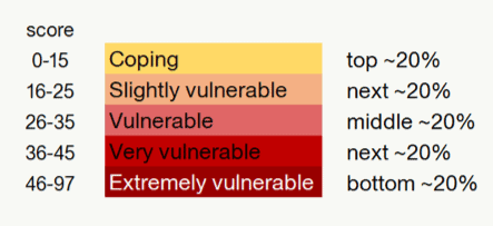 How we weighted: Overall, we determined scores based on the weight of burden an indicator may reflect, and which indicators are more likely to have longer-term, enduring impacts. The higher the score, the higher the likelihood of someone being vulnerable at this time.