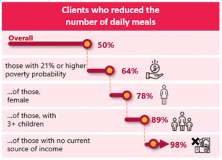 Skipping Daily Meals: This experience isn’t always a sign of serious food insecurity: Under normal circumstances, skipping the occasional meal is not particularly worrisome. But when it is forced upon a household due to the inability to procure food, it raises a major concern. Our model shows that raising the poverty threshold increases the likelihood of regularly skipping meals from 50% to 64%. Gender is another factor that affects this risk, especially when compounded with a larger family size of at least three children, as women and girls globally account for 60% of the chronically food insecure. This is consistent with other findings that women and girls tend to eat last and least within their households in countries facing conflict, famine and hunger.