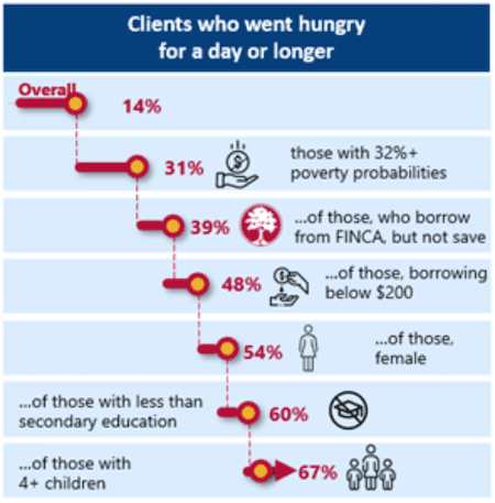 According to data we collected in 2020 and 2021, nearly four out of five FINCA customers experienced worsening food security because of COVID. People facing food insecurity need different types of support, depending on their circumstances. For those in extreme poverty, food and cash aid are needed to prevent starvation. At the same time, financial inclusion organizations like FINCA can adapt our support to address the evolving needs of our customers, who sustain their families mostly through self-employment and small-scale farming. Low-income people are already skilled at getting by on limited resources. With our help – in the form of responsible credit, savings and financial education – they may be able to stave off the worst effects of the worsening food crisis. Further expanding our investments in local agriculture, food processing and distribution will also help.