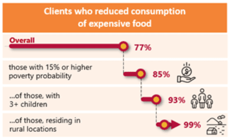 Reduced Food Quality: In terms of the first risk level, reduced food quality, we found that eliminating “expensive” foods was extremely widespread among our customers. This is troubling, because consuming lower quantities of high-cost items like meat and dairy can have severe health consequences, particularly for children and pregnant or nursing mothers. Income is the obvious driver of this risk: We found that eliminating the top earners in our sample raises the likelihood of degraded food quality from 77% to 85%. When considering household size (including only households with three or more children in the sample) and the disadvantages of living in a rural area, we found 99% probability that the household downgraded their food consumption. This is a vivid example of the particular vulnerability of rural households, who suffer the most from malnutrition and whose livelihoods are directly impacted by supply chain disruptions and climate change.