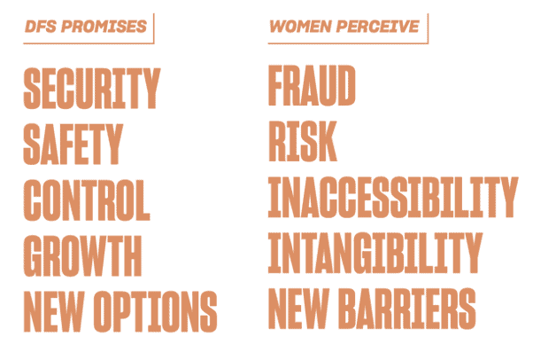 This leaves women with little time to do much else – including traveling to a DFS agent, which can be costly and time-consuming. This challenge is likely to be amplified during COVID-19. For instance, Halima, from Nigeria, got married as a third wife and has eight children. She walks her children to school every day and then heads back to do her house chores (fetching water, cooking and cleaning). She has no time in her day to do anything else, but she has dreams of running her own sewing business one day. She can’t imagine having enough time to leave the house for work, but would like to figure out how to operate the business out of her home.