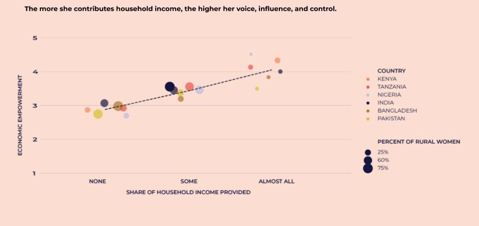 We worked with our data science partners at DrivenData to determine the most significant drivers of women’s economic empowerment, and we found that contributing to household income is the biggest indicator. Depositing funds directly into women’s accounts can have the same effect.