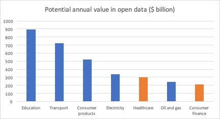 Machine-readable information in its public form – whether generated by governments, individuals or organizations – known as “open data” has been estimated to create $3 trillion in value per year across seven areas of the global economy. Health care and consumer finance are seen as the low hanging fruit of the global data tree, with powerful collection and reporting systems already coupled with international regulatory frameworks. Representing approximately $500 billion in combined value, these two areas provide a fertile and manageable proving ground for data innovation – while providing ready pathways into market categories that are significantly larger – from education and transport to consumer products and electricity to oil and gas.