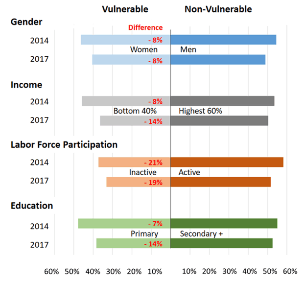 Inequalities in income and education are now more significant in dividing savers and non-savers. An 8 percent gap in 2014 between the poorest 40 percent and the richest 60 percent became a 14 percent gap in 2017. Similarly, the gap between primary and secondary school graduates doubled from 7 to 14 percent. That means gender, as a driver of inequality in savings rates, has fallen to the bottom among these factors.