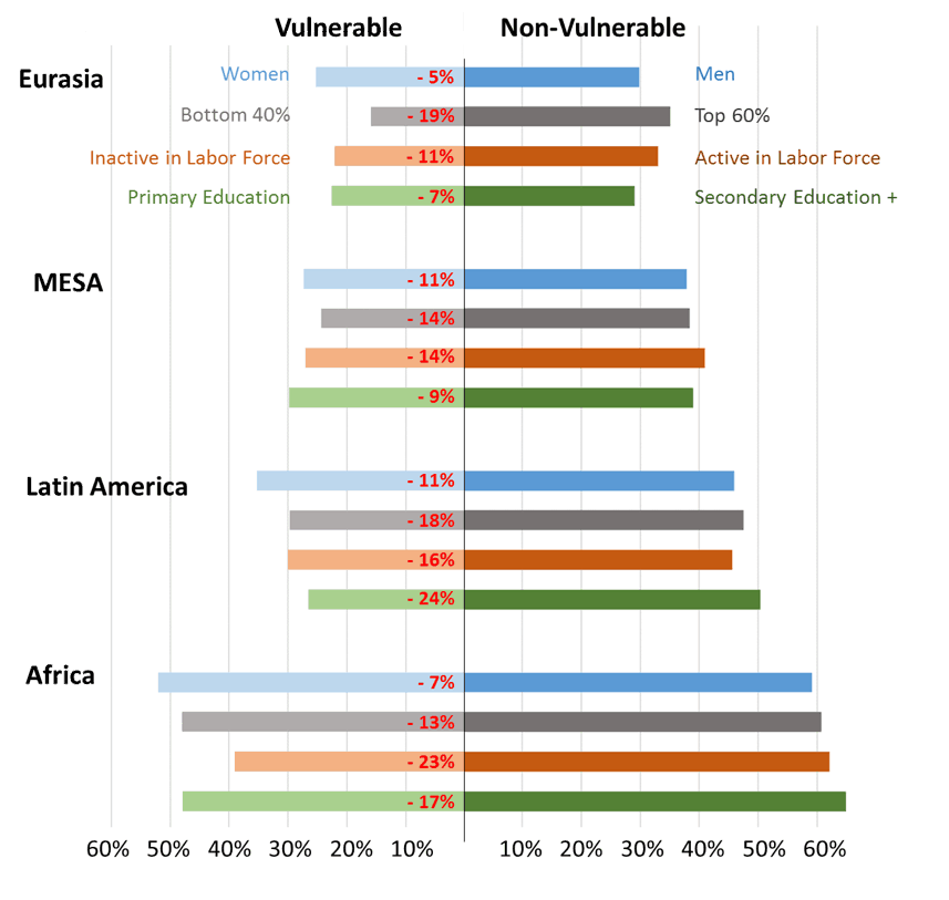 Changes in the savings rate between vulnerable and non-vulnerable groups also vary a lot by region, as shown in the chart below. In Eurasia, savings is driven mainly by income, which even surpasses labor force participation as a factor: The poor are 19 percent less likely to save than anyone else. In the Middle East and South Asia (MESA), no particular form of inequality stands out, which is striking given that this region has one of the highest rates of gender disparity. In Latin America, the real inequalities arise in education. People with only a primary education are 24 percent less likely to save, which is the biggest gap among all forms of inequality in the world.