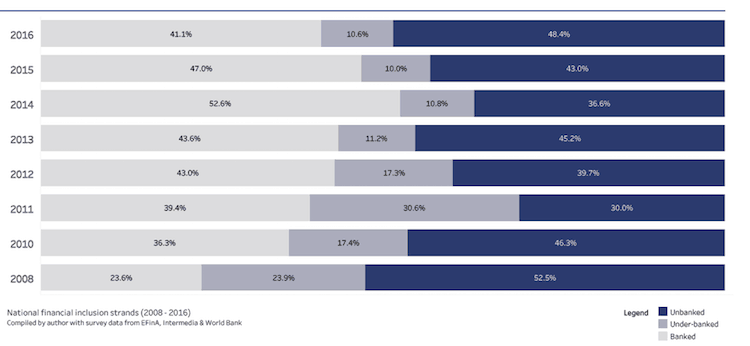 In 2012, the National Financial Inclusion Strategy was launched, an ambitious document that explained the goals of the Central Bank of Nigeria to reduce financial exclusion to 20 percent by 2020. Not long after, a three-tiered know-your-customer (KYC) regime was introduced, which enables financial service customers who are unable to satisfy all KYC requirements to still access financial services – albeit with limited transaction thresholds. In spite of these measures, exclusion has increased rather than decreased. Several factors are responsible for this, including the fact that a majority of the unbanked population resides in rural and remote regions, (Nigeria is about 51 percent rural). An underdeveloped mobile money and banking agent network and a general distrust of the financial services industry on the part of customers also contribute to this exclusion.