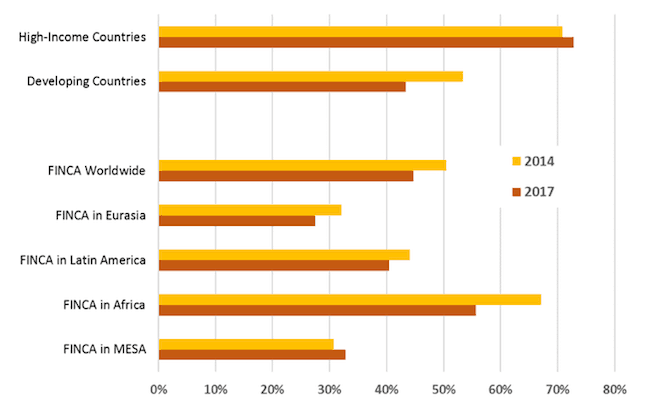 Outside of FINCA’s footprint, East Asia and the Pacific fell the most, from 71 percent to 53 percent.
