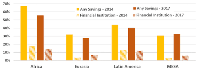 It’s worth repeating that we are not just talking about formal savings at a bank account, which is only a fraction of total savings. As seen in the chart below, the rate of formal savings is abysmally low in all regions, but it has not really changed outside the margins of error anywhere except in Africa. Instead, among all regions and categories, the biggest drop is in “any savings”— and again, Africa stands out.