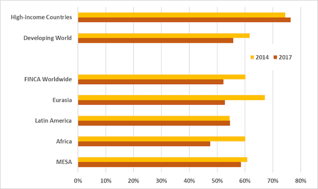 Outside of FINCA’s footprint, East Asia and the Pacific fell the most, from 71 percent to 53 percent.