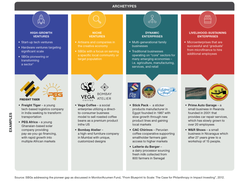 Hence, in this report we seek to explore how to improve the scalability and viability of early-stage finance provision, thereby reducing the need for philanthropic capital and subsidies among the local providers of finance and support to early-stage enterprises. We identified three main archetypes of early-stage finance providers to study in detail, namely: business accelerators, business angel networks and early-stage venture capital funds, together with broad category of supplemental, non-traditional debt options. Each of these four categories detailed in the report face challenges in providing finance to SGBs, and any investment approach needs to reflect the sophistication of local ecosystems and construct its funding modality accordingly.