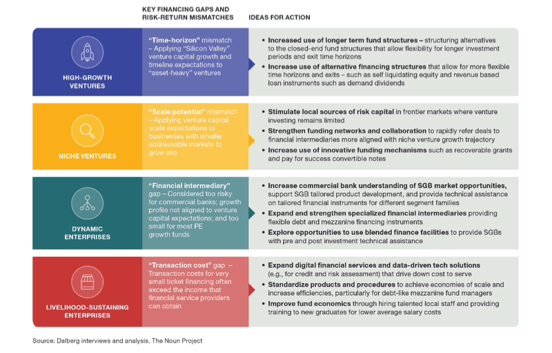 Looking at current SGB financing through the prism of the four enterprise families helped us to identify a roadmap for what we need to do in order to address the existing $930 billion SGB financing gap[1]. For each family we see clear financing gaps — but also clear examples of promising solutions being developed to address those gaps. The report highlights ideas for action (see the figure below) — many of which innovative investors and intermediaries are already advancing. We think it will be critical to implement and scale up these ideas, in order to unleash the potential of SGBs to drive economic growth and impact.