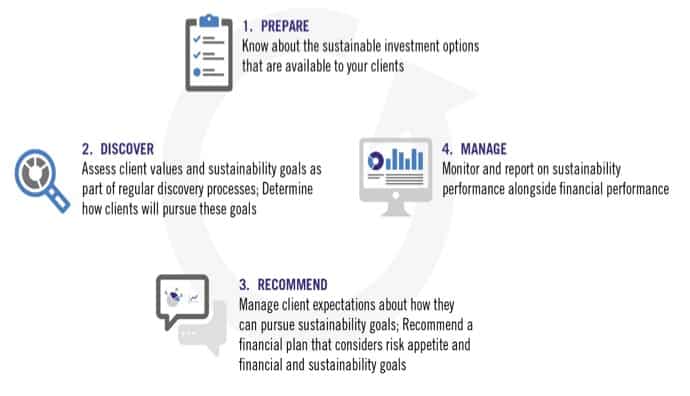The process for developing and recommending a sustainable investment plan is the same as the process for vetting conventional plans and approaches: First understand what the client is looking for and then solve for it. That is, when recommending a sustainable investment strategy, advisors should consider the client’s performance expectations, risk appetite and other important contextual factors as they normally would (e.g. insurance issues, tax considerations, capital gains and losses, estate plans), alongside their consideration of the client’s sustainability goals.