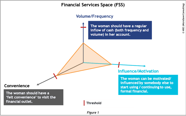 An FSS (see Figure 1) can be understood as a three-dimensional space that represents a conducive environment for a person to conduct financial transactions independently. Each woman user has a unique FSS — determined by thresholds on each dimension. Ideally a woman needs to cross the threshold of all three dimensions to start using financial services, and to sustain the usage. However, if a woman crosses the threshold for even one or two of these dimensions, it can lead her to use financial services, including digital services.