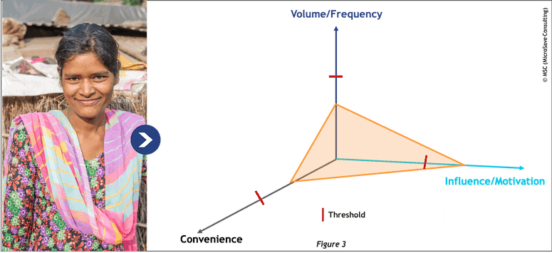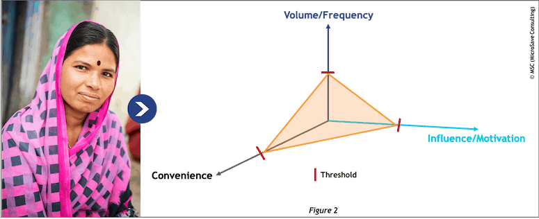 The FSS in Figure 2 is for a regular basic user like Malti, who we introduced at the beginning of this article. Malti has crossed the threshold for all three dimensions: The suggestion by her husband acted as the motivation factor to open the account; the regular remittances he sends covers the dimension of volume/frequency; and the digital financial services (DFS) agent in Malti’s village makes the cash-out operation quite convenient for her.