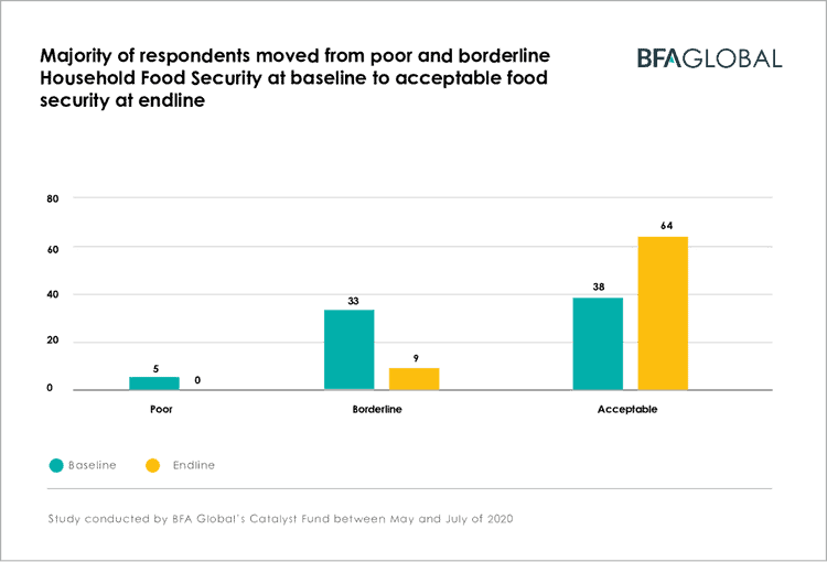 Not only were the households better off in terms of food security, their financial security also improved. The households were able to save during the period, instead of continuing to spend their savings as income was reduced. At the end of the program, 34% of the households said they had been able to put money aside for emergency funds – an increase of 30% from the baseline. Overall, 76% of the respondents said that the voucher program had improved their financial health significantly.