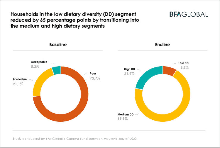 Similarly, the proportion of households experiencing low dietary diversity (as per the Household Dietary Diversity Score) dropped dramatically, with 65% of households moving up from low dietary diversity to medium or high diversity, meaning that households moved to consuming more types of foods. A more diverse diet means that nutrition is more likely to be complete.