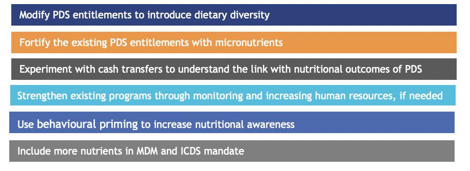 - PDS food baskets should include more dietary diversity, featuring local millets such as ragi and jowar, which are cheaper than wheat or rice. The program could then use the money saved to provide subsidized lentils to beneficiaries. This variety of food would ensure adequate dietary diversity among recipients. These interventions should accompany nutrition literacy initiatives to ensure uptake and penetration among the target population.