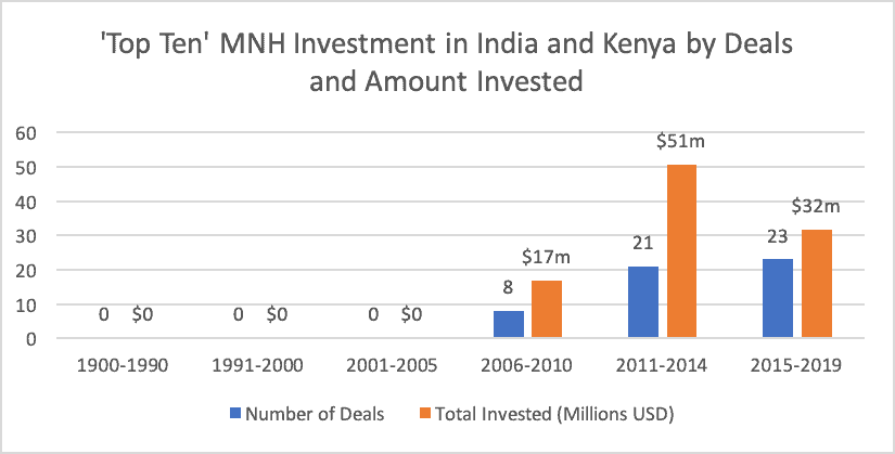 According to Pitchbook data, prior to 2011 there were only seven investors that made any deals in MNH enterprises within India or Kenya. This has increased by nearly tenfold, with over 70 investors that have made active deals as of 2019. From 2006-2010, the first time period in which any investment was made in MNH enterprises within India or Kenya, the top 10 investors were all privately held venture capital firms or merchant banks that collectively invested US $17 million in four distinct MNH-related companies, which were mainly hospitals, maternity services or genomic-related companies. After SL@B’s debut, in early 2011 through 2014 and from 2015 to the end of 2019, the top 10 list of investors included nonprofit venture capital funds, governments and accelerators/incubators that collectively invested more than $82 million in 22 MNH enterprises. These funded enterprises included social impact organizations, innovators based in LMICs and a greater inclusion of seed/early-stage innovations. The investors themselves in 2019, compared to pre-2011, were not limited to higher-income countries but also represented domestic investment firms that are based in India and Kenya.