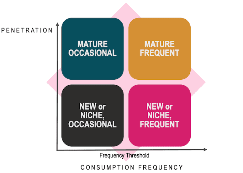 - A product with high existing penetration (i.e., one located in the top left category of the matrix, “mature occasional”). Such products will require dedicated marketing efforts to anchor the product into habits, using consumption frequency tactics such as the ones proposed in Tool 4 below.