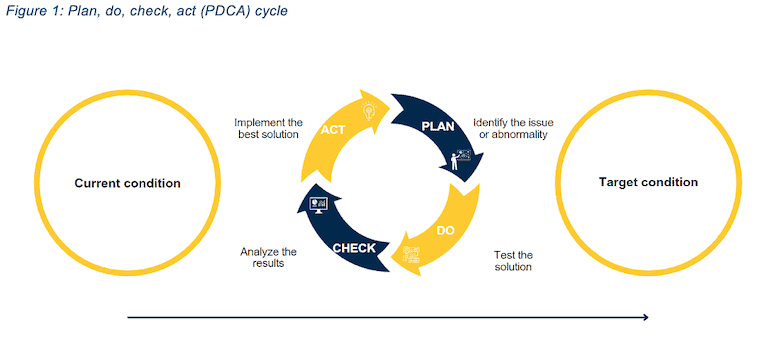 The foundation of these experiments is the “Plan, Do, Check, Act” (PDCA) cycle. In the Plan stage, a business runs diagnostics to identify gaps and abnormalities in its processes, defines its goals, and develops an action plan. In the Do stage, it moves into action, pursuing the goals and tasks it has defined through an experiment. This is followed by the Check stage, in which the business assesses the improvements it has made by analyzing the results of the experiment. Finally, in the Act stage, it implements the solution and continues applying PDCA to identify new potential issues. The PDCA cycle is meant to be repeated again and again for continuous improvement. It provides a simple and effective approach for solving problems and managing change, whether for an entire project or a small task within the project (See Figure 1 below).