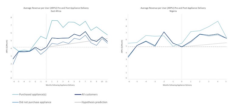 This growth in consumption suggests that mini-grid developers can raise revenues by implementing appliance financing schemes. Average revenue per user across all customers also saw significant increases sustained over time. In East Africa, revenues are 18% above baseline levels after 11 months; in Nigeria, that number is 25% after five months.