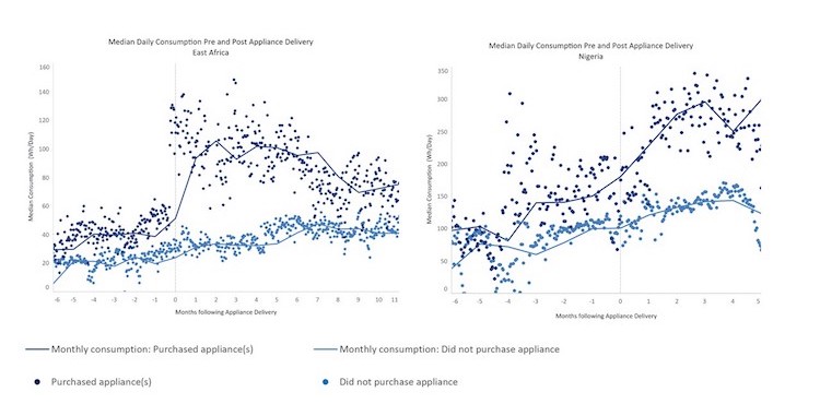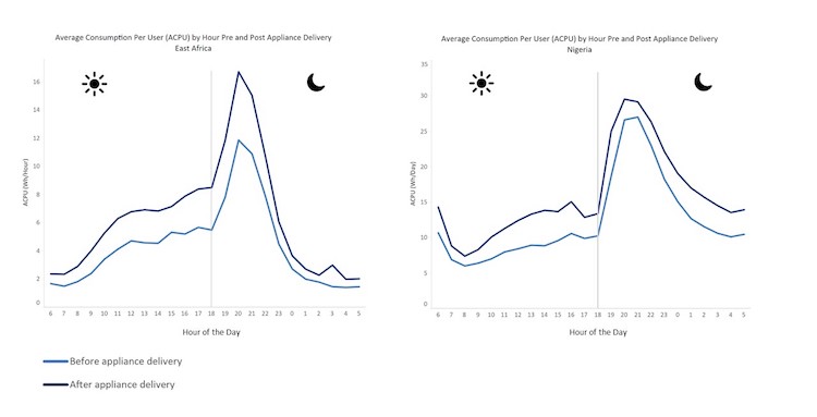 Early results suggest that rural mini-grid customers are constrained in their power usage. They are able and ready to consume more electricity, but don’t have the means to put this electricity to use. This can be seen in the fact that appliance purchasers in both regions consumed nearly twice as much electricity for the first five months following appliance delivery. Speakers and TVs drove the greatest increase in site-wide consumption (aggregated across all customers at a single site) and average revenue per user, due to their outsized popularity.