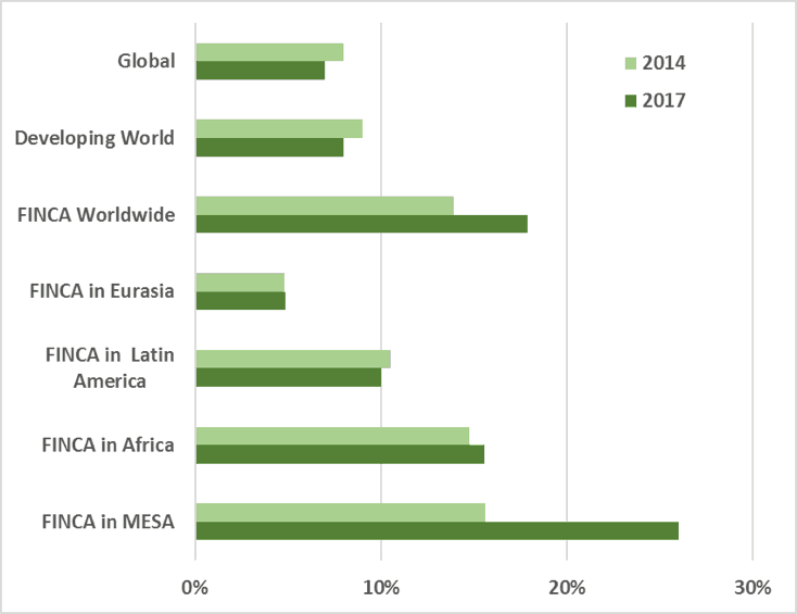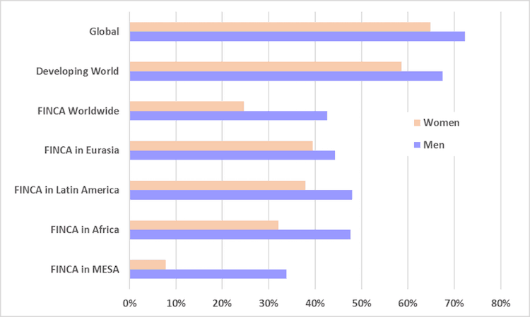Our organization, FINCA International, and the network of 20 community-based microfinance institutions and banks collectively known as FINCA Impact Finance, are working at the epicenter of women’s financial inequality. In the countries where we work, the difference in account ownership between men and women is 18 percent—more than double that of the developing world overall. At the regional level, Eurasia is actually a bit less unequal than the world at large, but there are striking disparities elsewhere, especially in Africa and the Middle East and South Asia (MESA) regions.