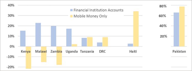 As I wrote in a previous article for NextBillion, there are only a few countries in the FINCA Impact Finance network where a significant number of people rely only on mobile banking as their sole source of financial services. Traditional bank accounts are still the norm, with mobile banking being used as an additional service. There are, however, some countries where mobile banking plays an important role in expanding financial access, mostly in Africa, and a few others (like Haiti and Pakistan) where it is emergent. Here, we can compare the gender gap between financial institution and mobile money accounts to see what effect mobile banking services are having on women’s financial inclusion.
