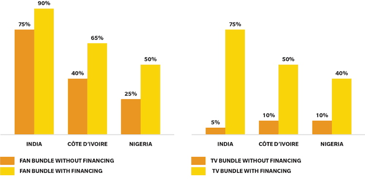 It’s estimated that there are 425 million off- and weak-grid households in South Asia and sub-Saharan Africa. Around half of those households could afford off-grid TVs and fans, and about 15% could afford a refrigerator with affordable consumer financing. However, when considering accessibility—the fact that customers must actually have access to finance, and distributors must be able to reach households physically to sell and service appliances—the size of the market drops to 39 million for fans, 36 million for TVs and 11 million for refrigerators. The takeaway: Financing is still critical to make the business model work. The figure below shows the share of households in key countries that are able to afford appliances, with and without financing.
