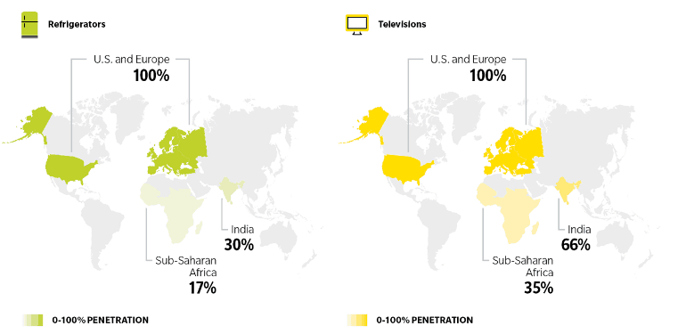 Achieving energy access is about much more than connecting households to the grid, or getting them a rooftop solar panel. People need access to the appliances that can deliver life-changing services that reduce time spent on household chores, open up opportunities to generate income, and improve connectivity to their communities and the world. The typical household in rural sub-Saharan Africa owns two to five appliances, but it’s common for households in more developed countries to have 30 or more appliances. The figure below shows the discrepancy in common appliance penetration by region – and for households in rural sub-Saharan Africa (grid and off-grid), the percentages are even lower: 17% for TVs, 4% for refrigerators and between 6-8% for fans.
