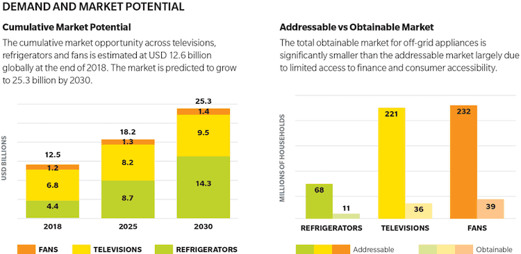 The cumulative market opportunity across off-grid televisions, fans and refrigerators is estimated at US $12.6 billion globally. The market has the potential to double to US $25.3 billion by 2030, driven primarily by refrigerator and television demand. It is transforming from a sector primarily supported by public aid and philanthropy, to a market that is attracting investment and interest from private sector actors and large multinational companies. And since overall appliance penetration is low in off-grid markets, there is significant untapped demand.