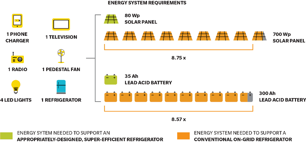There are strong incentives in the off-grid appliance sector to innovate on efficiency, because consumers see the savings up-front due to the reduction in the total cost of the system (i.e.: smaller solar panels and batteries are needed to achieve the same level of energy service from appliances.) The figure below shows that the number of solar panels and batteries needed can increase by a factor of eight if efficiency is not prioritized. Product development continues to balance efficiency innovations and affordability constraints, given the number of low-income customers. But we’re still seeing innovations and efficiency gains in the sector: For example the 2019 winners of the Global LEAP Off-grid Refrigerator Competition averaged 28% greater overall efficiency compared to 2017 Winners.