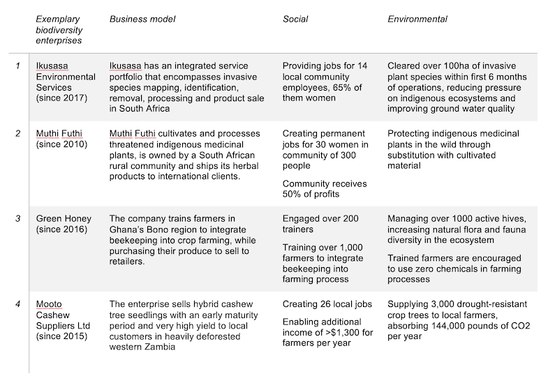 The table below gives several thriving examples of biodiversity entrepreneurship. For example, enterprises like Ikusasa Environmental Services, which operate in areas with uncontrolled invasive plant species, have specialised in products such as essential oils made from processing these plants, thereby increasing biodiversity integrity while generating profits. Enterprises in highly diverse ecosystems, such as primary rainforests, have established partnerships with indigenous communities and farmers to sustainably buy, harvest and process medicinal plants and herbs (e.g., Muthi Futhi) and honey (e.g., Green Honey), ensuring an equilibrium of resource extraction and fair product prices. And tree nurseries focusing on climate-resilient cashew seedlings (like Mootoo Cashew Suppliers) generate revenue while simultaneously rebuilding depleted ecosystems.