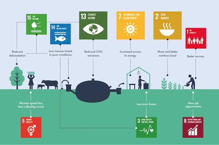 SDG 2: Zero Hunger: As mentioned above, the chemical reaction that produces biogas within a biodigester generates a by-product, bio-slurry, which is an effective organic fertiliser. When treated with bio-slurry, crops tend to have higher levels of nutrients and protein than with other types of organic fertilisers. This can lead to the production of more nutritious food for farmers and their communities, reducing rates of malnutrition.