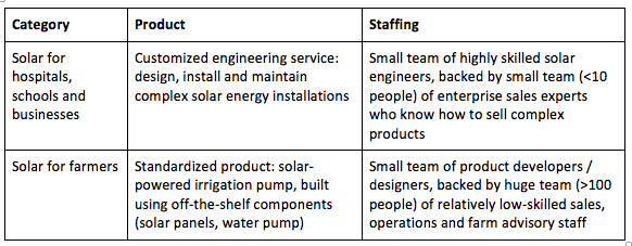 While we struggled to get both of these businesses off the ground, we got advice from several successful solar entrepreneurs. We realized that building a successful product business, as we were trying to do with our solar for farmers product, is extraordinarily difficult. They strongly advised focusing on only one product at a time; even adding a second similar product too quickly created challenges.