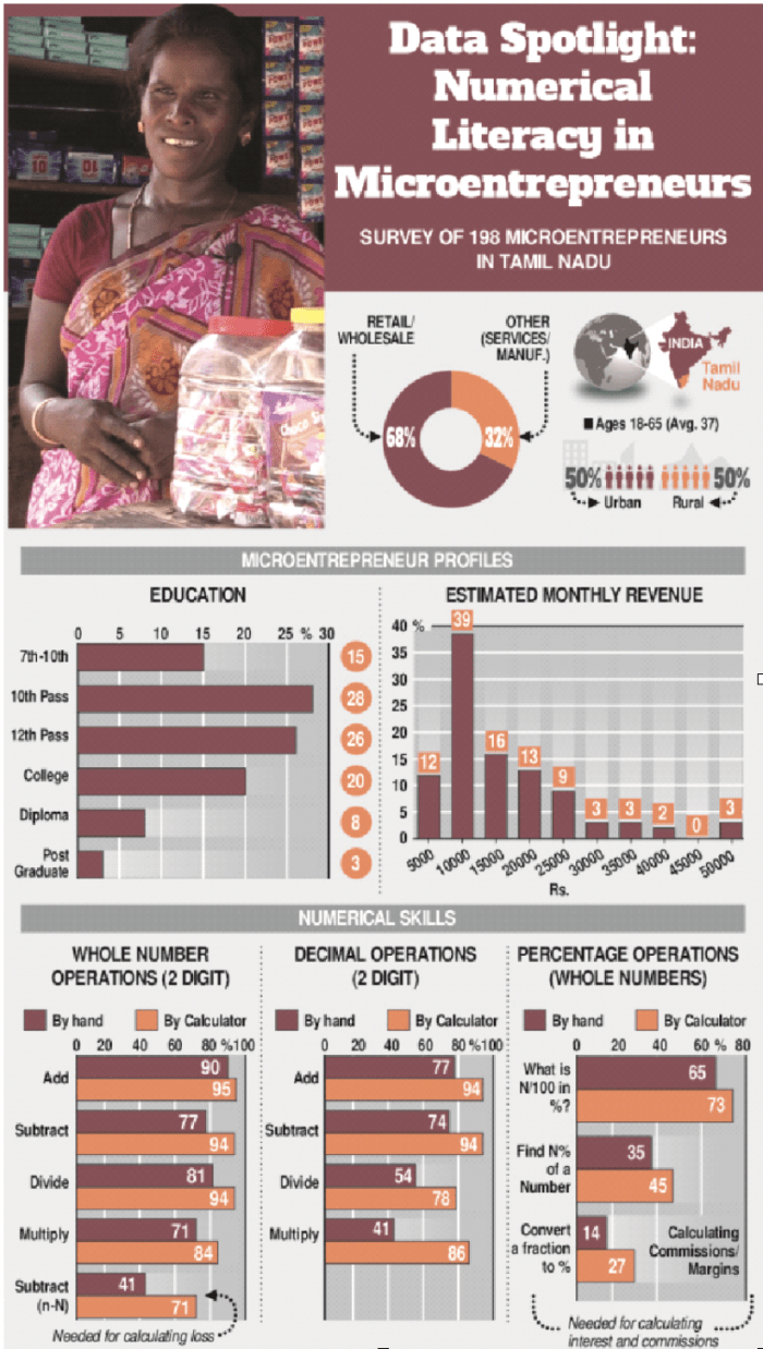 As part of a study to identify whether basic math skills contribute to entrepreneurial success in rural India, Madura Microfinance conducted a study on the numerical capabilities of microentrepreneurs. Of the 198 microentrepreneurs surveyed, 85 percent had completed a tenth grade education or more. The test covered basic arithmetic operations with and without decimals. The test was done first by manual calculation (by hand). Then participants were given time to repeat the exercise with a calculator. We were surprised by the results, and you might be too.