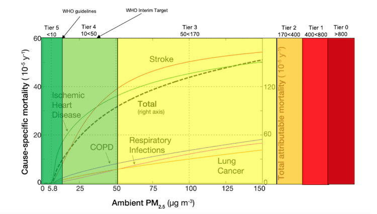 The mortality rates for diseases attributable to ambient particulate matter (PM), adapted from the original, available here. Most “improved” cookstoves being deployed today yield particulate exposure in the right hand side of the graph, Tiers 1 to 3, posing significant health risks.