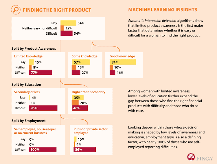 This same pattern holds when we look deeper into the data. Going beyond descriptive analysis, we used machine-learning to create a model of consumer struggling, where the goal was to predict whether it was easy or hard for a woman to find the right product. We used a supervised learning algorithm with automatic interaction detection (a data analysis method that looks at how different variables in the model interact with each other) to classify female respondents by the level of difficulties they experienced in finding the right financial product. At each step, the algorithm tested every possible variable that might cause women to have trouble finding a suitable product, to identify those factors that contributed most to this issue. The process repeats until no further factors are found to have a statistically significant effect on women’s ability to find appropriate financial products.