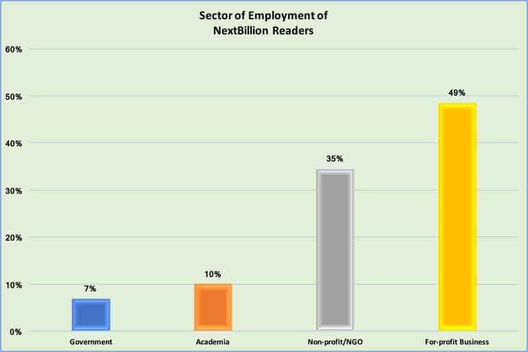 The first question was straightforward: What sector do you work in? As you’d expect from an enterprise-focused site like NextBillion, for-profit business dominated, with almost half of readers working in the sector.